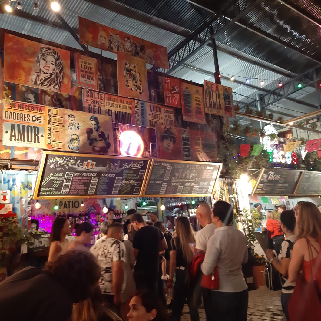 Todo este acontecer se vive al ritmo de una música muy caribeña, o al menos bien movida, la cual inevitablemente te hace conversar, comer, y tomar acompañando mínimamente el ritmo con los pies. No es un detalle menor, creer que este ambiente festivo se deja llevar por cierta inercia. Las altas y brillantes luces que acompañan al espacio físico, permiten visualizar una